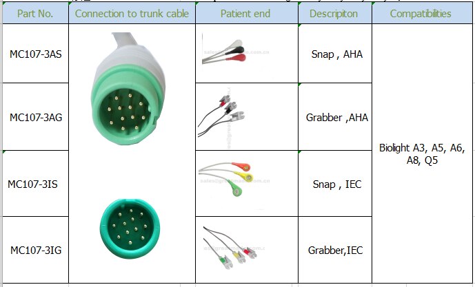 Tshaj Tawm Biolight A3, A5, A6, A8, Q5 ECG cable nrog leadwiresie. IEC, 3-Txhuas, rub tawm, ntsuab 12pin