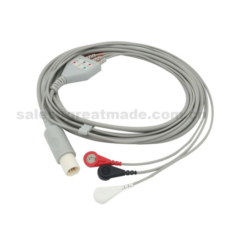 Ib Daim ECG Cable nrog 3-Txhuas Leadwires Tshaj nrog Hellige SCP 844, SCP 851, SCP 852, SCS 804 rau Tus Neeg Mob Saib Xyuas, AHA, Snap